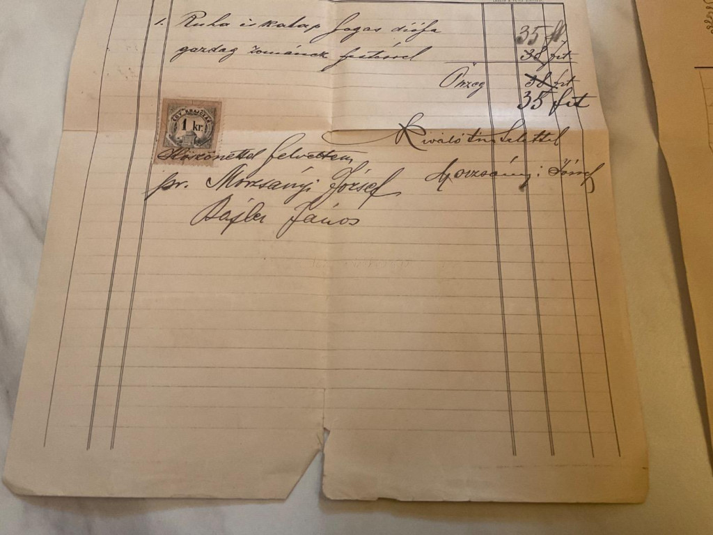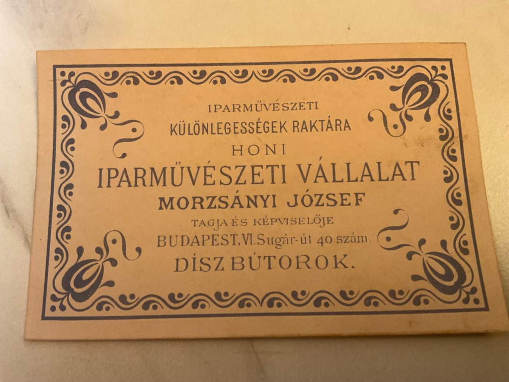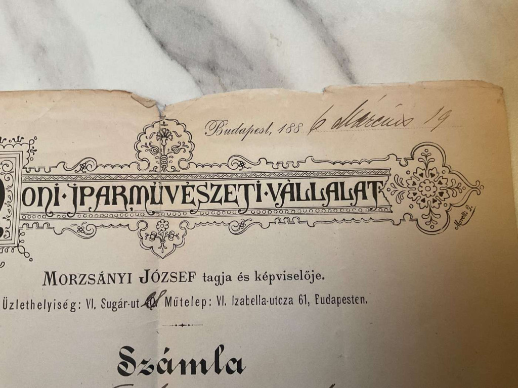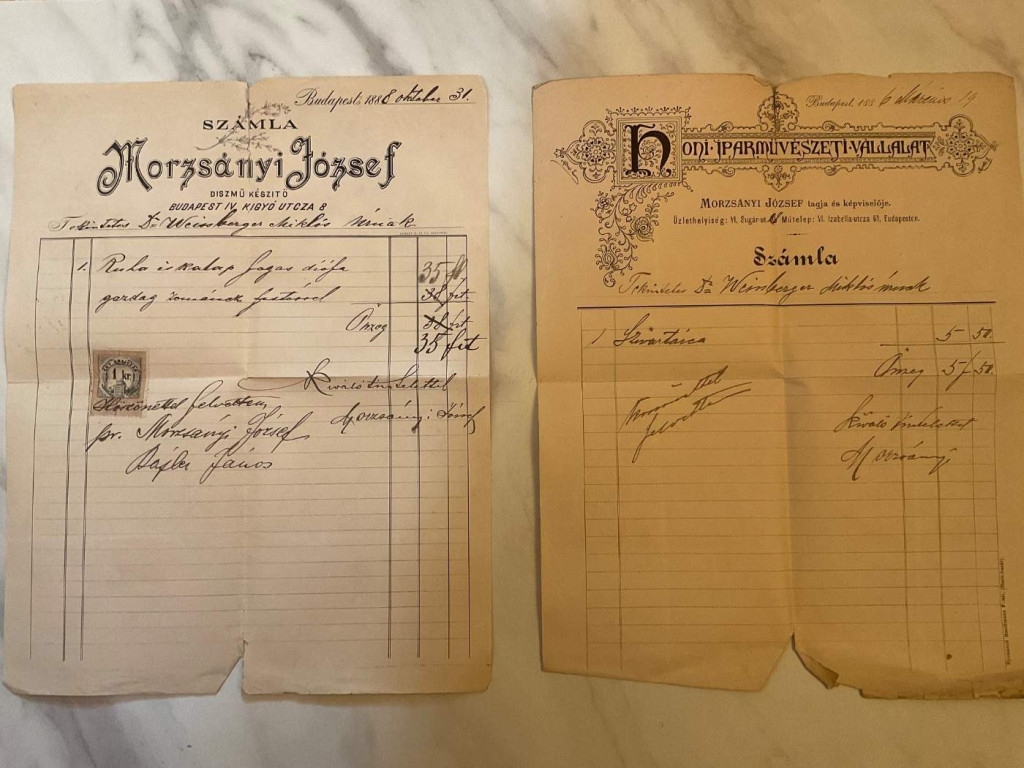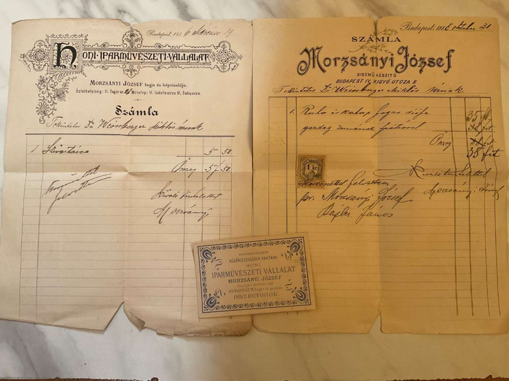 1886-88 Morzsányi József díszmű készítő 2 db számla, Morzsányi József aláírásával, szakadt, az 1988-as 1. kr. okmánybélyeggel. + Díszbútorok. Reklám címke, 7x10 cm. A képeken látható állapotban.