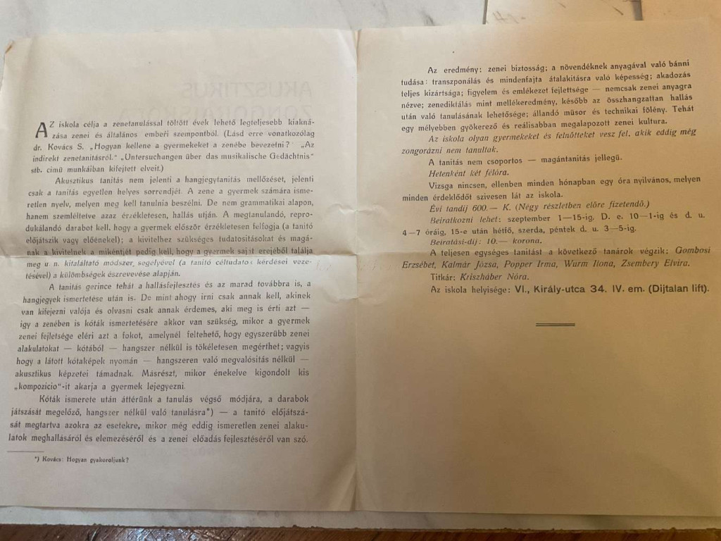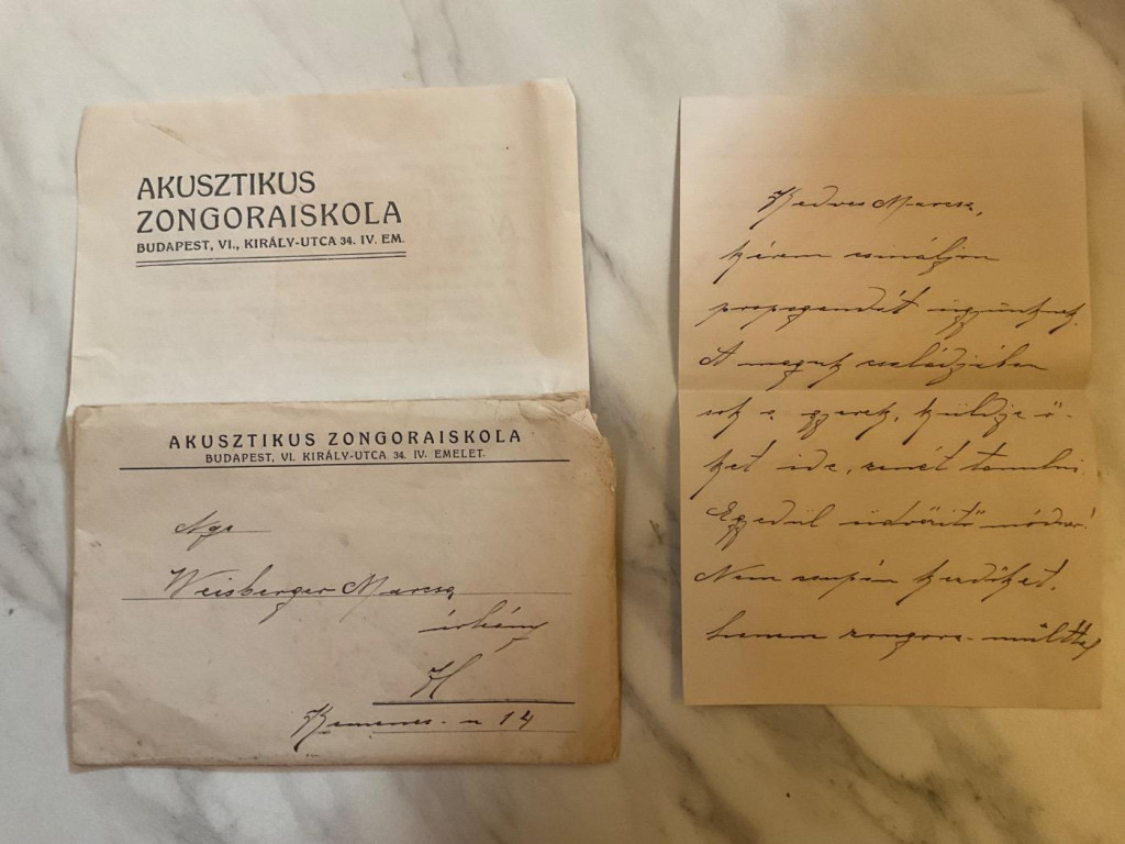 1918 Zsembery Elvira (1893-1977) erdélyi magyar zongoraművész, zenetanár autográf levele Weisberger Marcsa részére, két beírt oldal, aláírással + hozzá tartozó "Akusztikus Zongoraiskola" fejléces boríték + ismertető prospektus. A képeken látható állapotban.