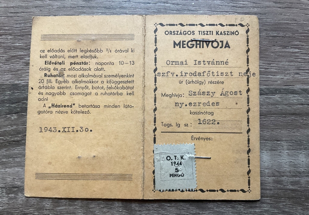 1943 Országos Tiszti Kaszinó fényképes meghívója (igazolványa)