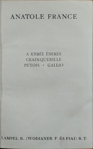 1. A kyméi énekes és egyéb elbeszélések (ford. Nyitray József) 2. Crainquebille - Putois (két elbeszélés, ford. Gábor Andor) 3. Gallio - Elbeszélés (ford. Gábor Andor)