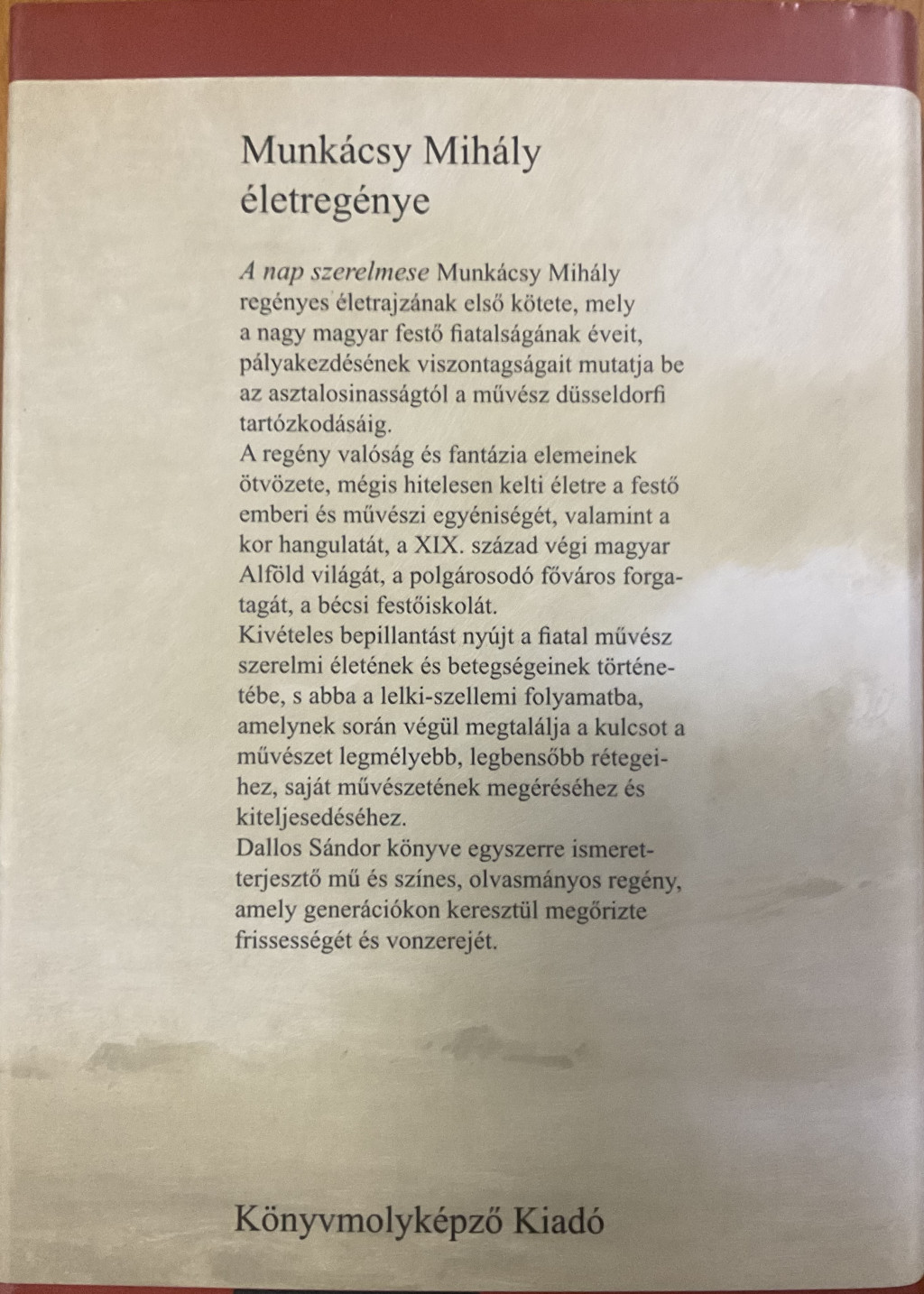 A nap szerelmese Munkácsy Mihály regényes életrajzának első kötete, mely a nagy magyar festő fiatalságának éveit, pályakezdésének viszontagságait mutatja be az asztalosinasságtól a művész düsseldorfi tartózkodásáig.