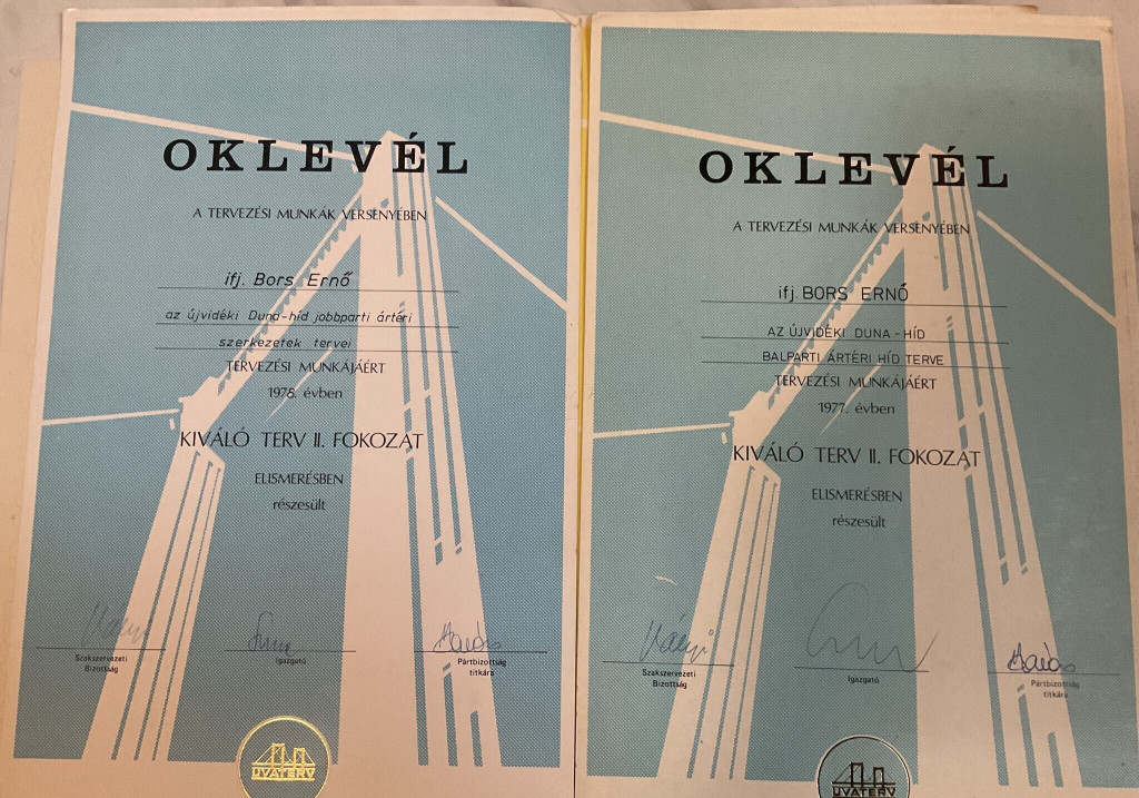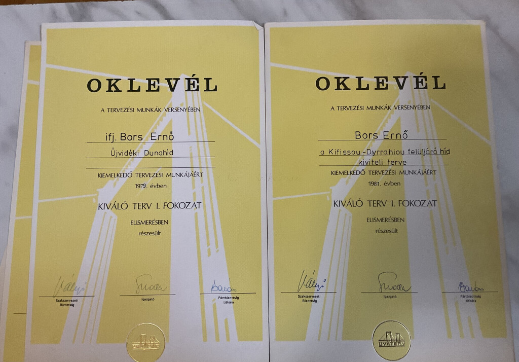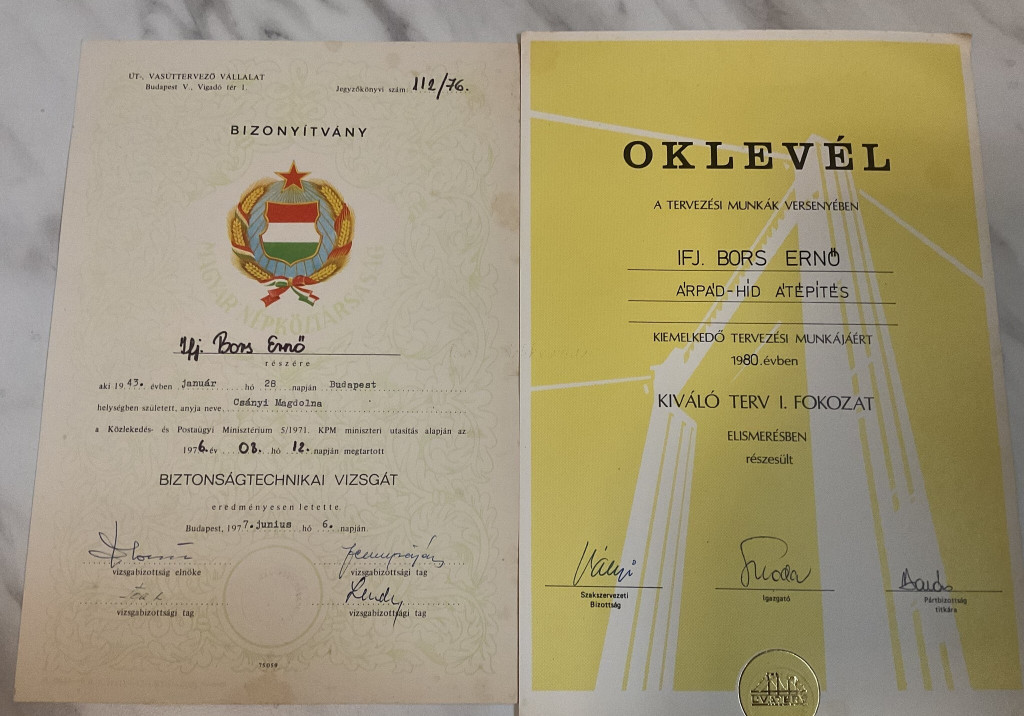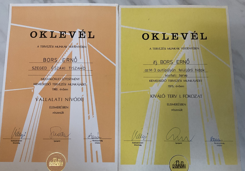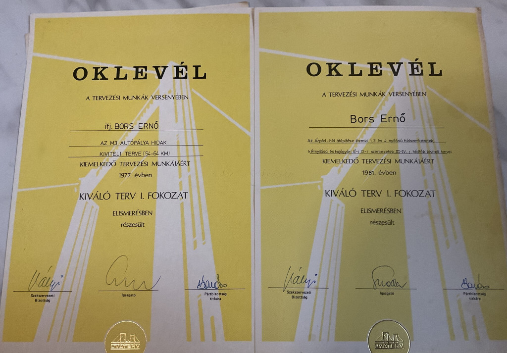 Hídépítéssel kapcsolatos oklevelek (ifj.) Bors Ernő részére az 1976 és 1995 közötti időszakból, köztük a Lágymányosi-híd építésében végzett munkájáért, feliratozott nemzeti szalaggal (Lágymányosi Duna-Híd 1995).