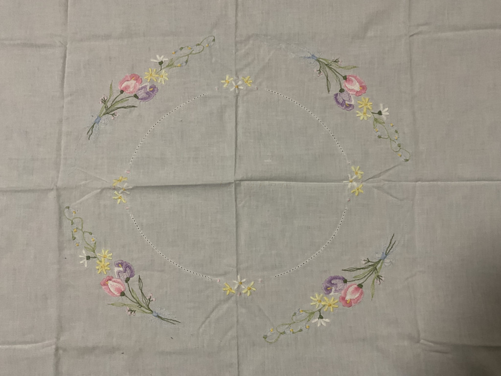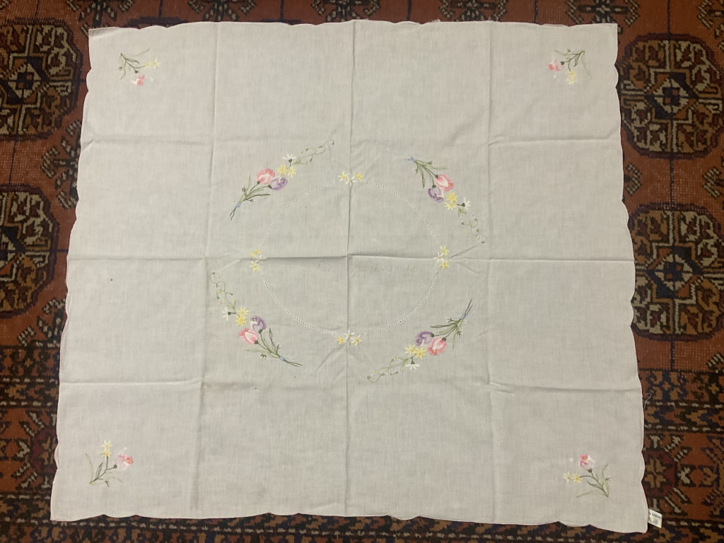 Hímzett terítő, egyszerű mintákkal