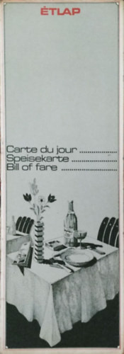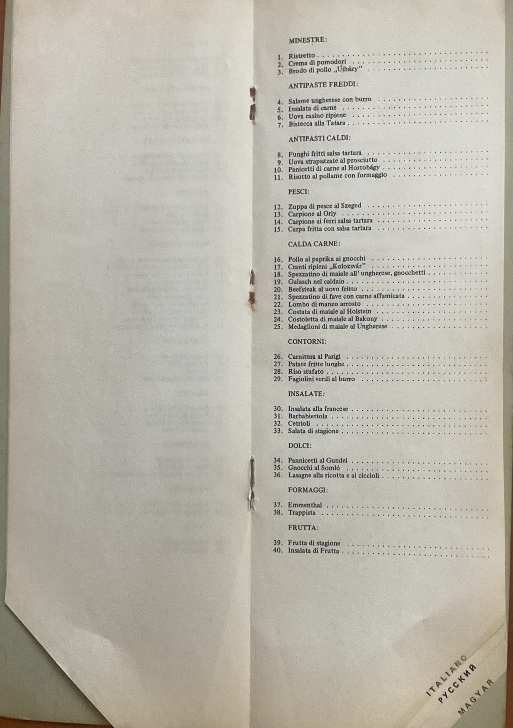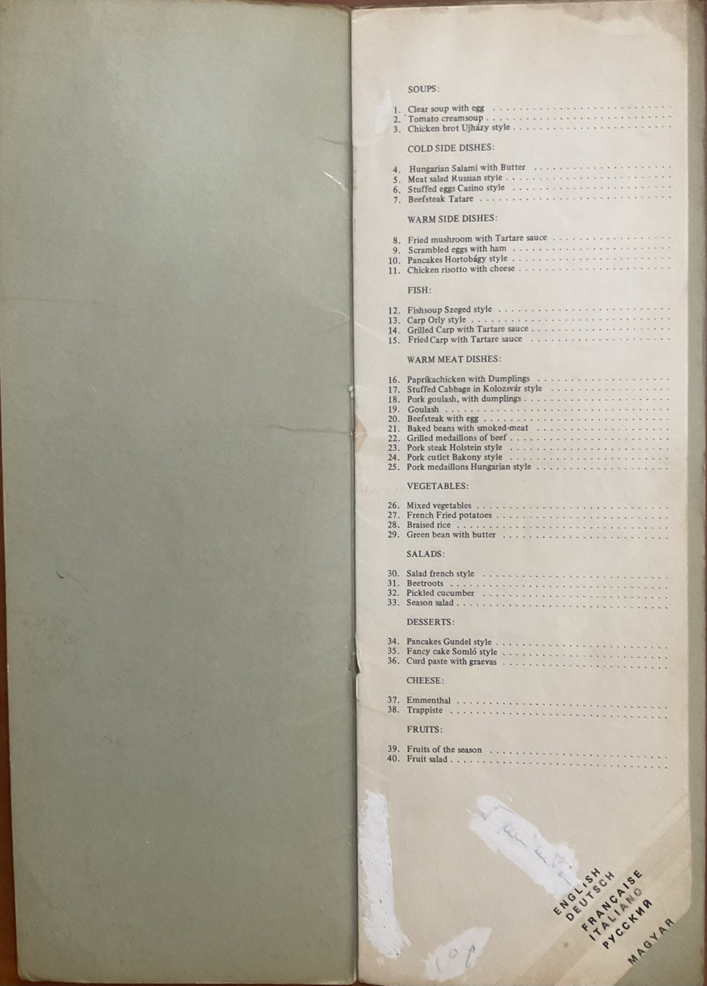 Negyven tételes, hatnyelvű (angol, német, francia, olasz, orosz, magyar) étlap