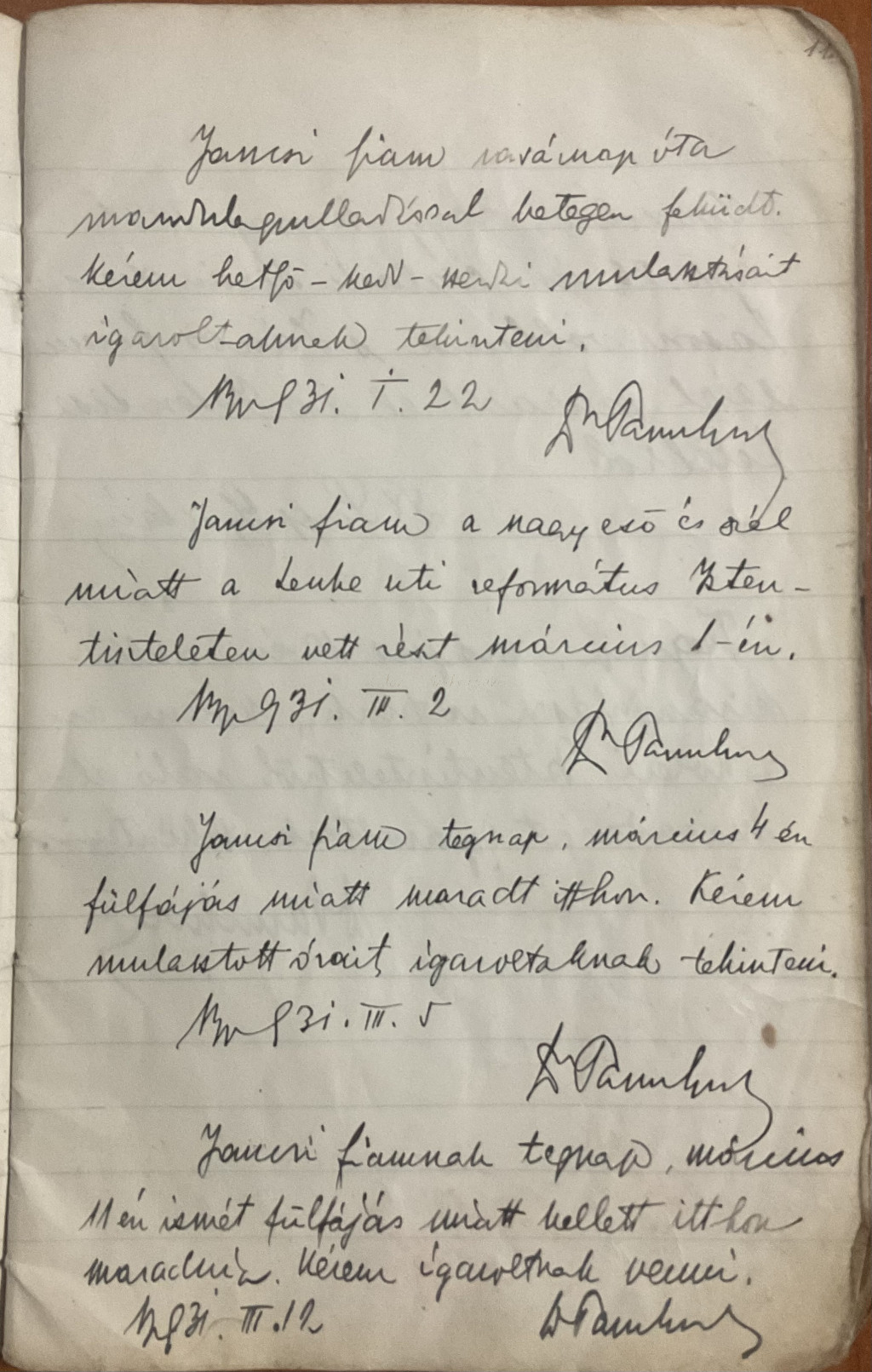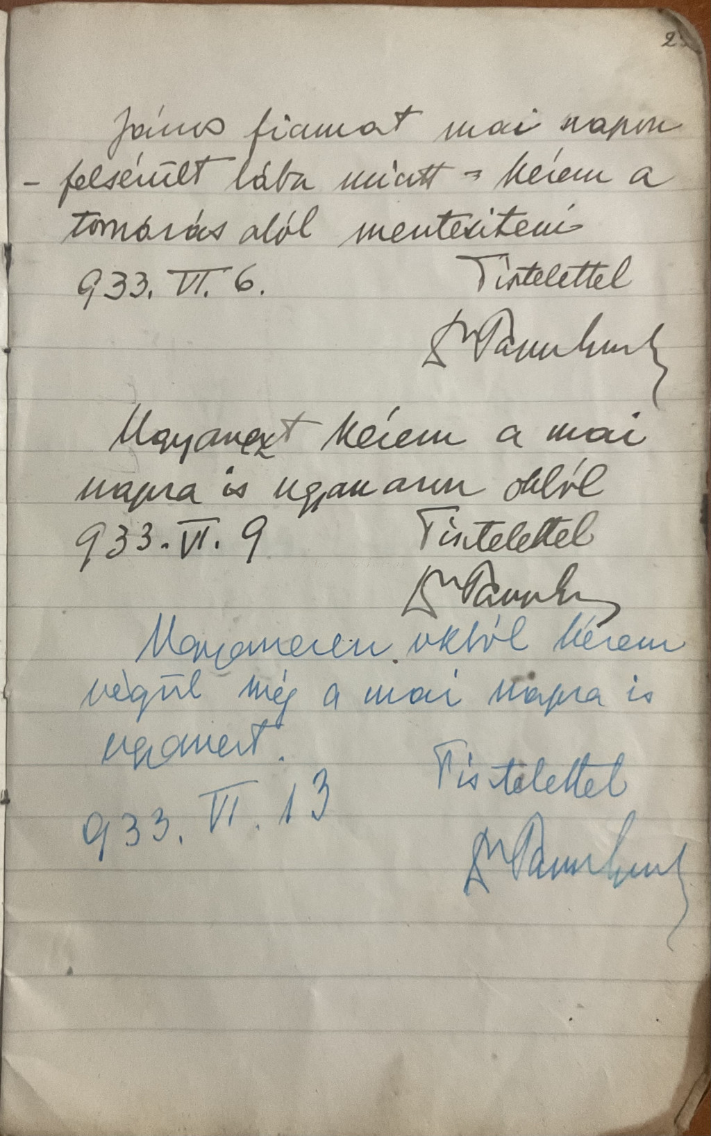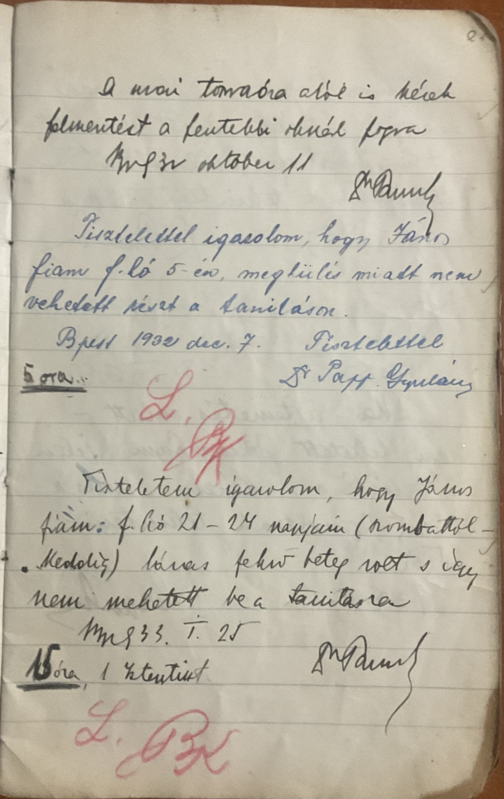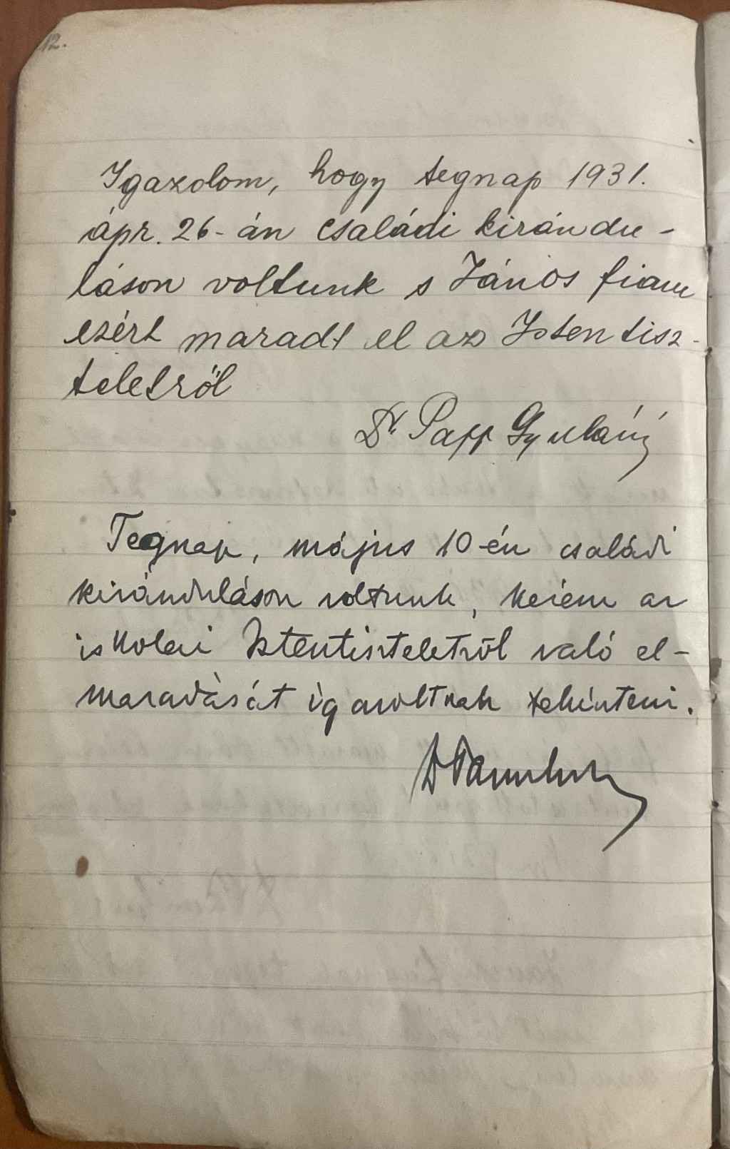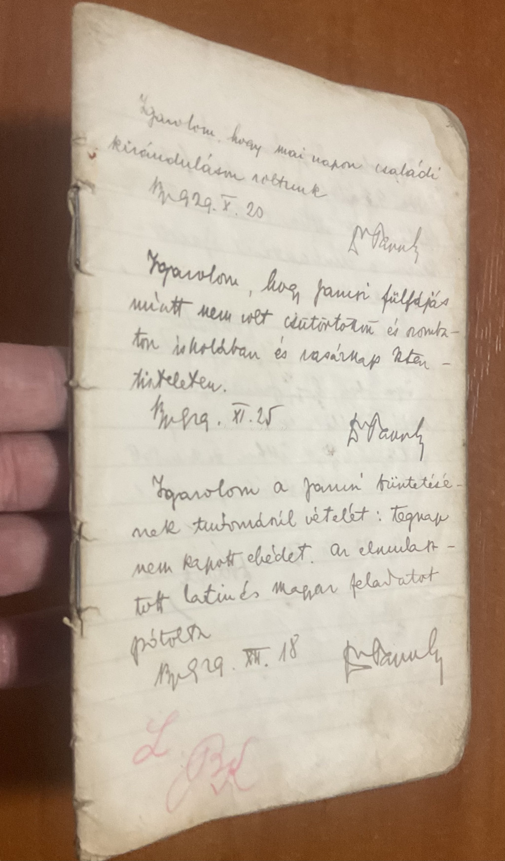 Az 1930-as évekből származó eredeti üzenő füzet, amely Papp János iskolai mindennapjait örökíti meg. A kézzel írt bejegyzések között szülői igazolások, hiányzások és hétköznapi események elevenednek meg, hiteles korabeli hangulattal.