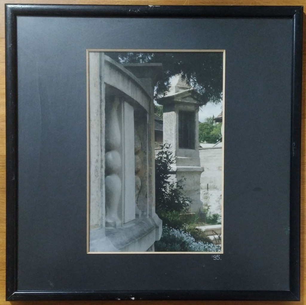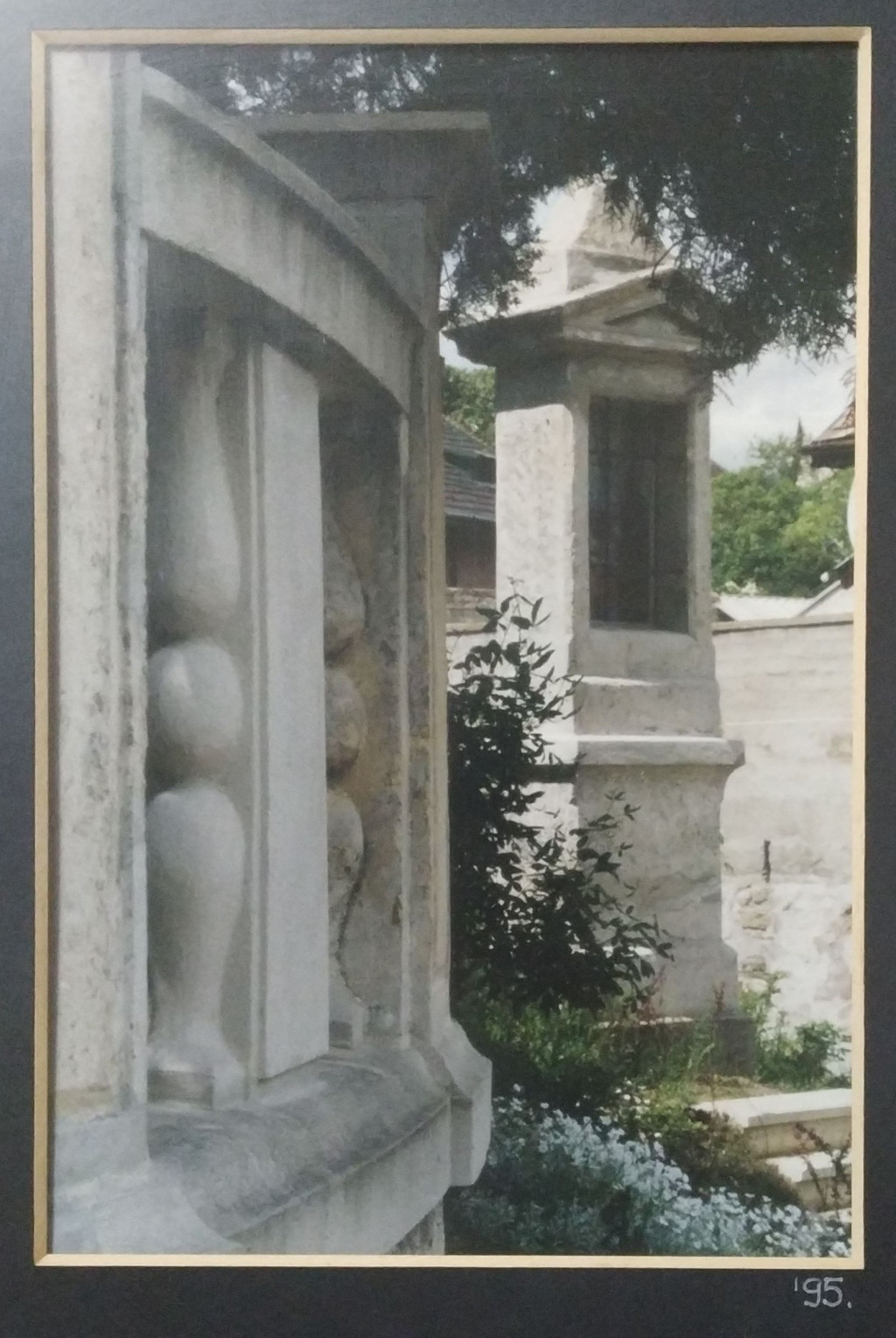 Szél Ágnes (1944- ) fotóművész jelzett felvétele (Temetőrészlet). Paszpartuban, plexiüvegezett fakeretben, a hátoldalon címkével és datálással, a kereten kisebb felületi sérülésekkel. Mű mérete: 29x19 cm,