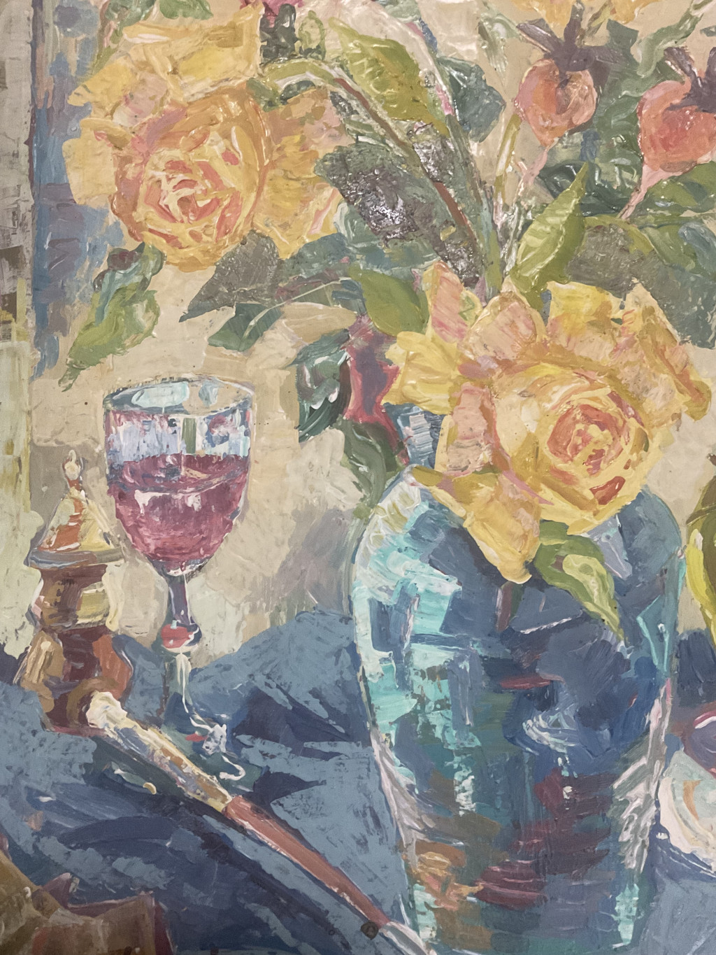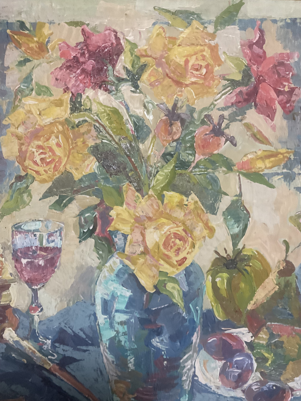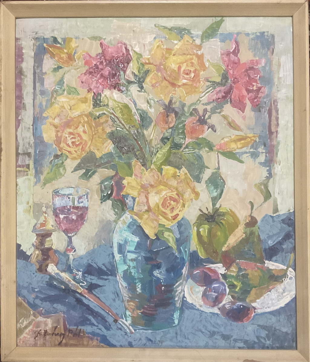 Szilvásy Pál festészetének jellegzetes darabja ez a színekben gazdag, lendületes csendélet, melyen a művész érzékletesen jeleníti meg a virágok és gyümölcsök harmóniáját egy pohár borral. A kompozíció középpontjában egy kék váza áll, benne élénk sárga és bíbor virágokkal. A festő vastag, határozott ecsetvonásokkal, oldott felületkezeléssel dolgozott, ami friss, vibráló hatást kelt. A háttér pasztelles árnyalatai és a terítő mélykékje szépen ellenpontozzák a virágok meleg színeit, így az egész kép derűs, mégis elegáns hangulatot áraszt.