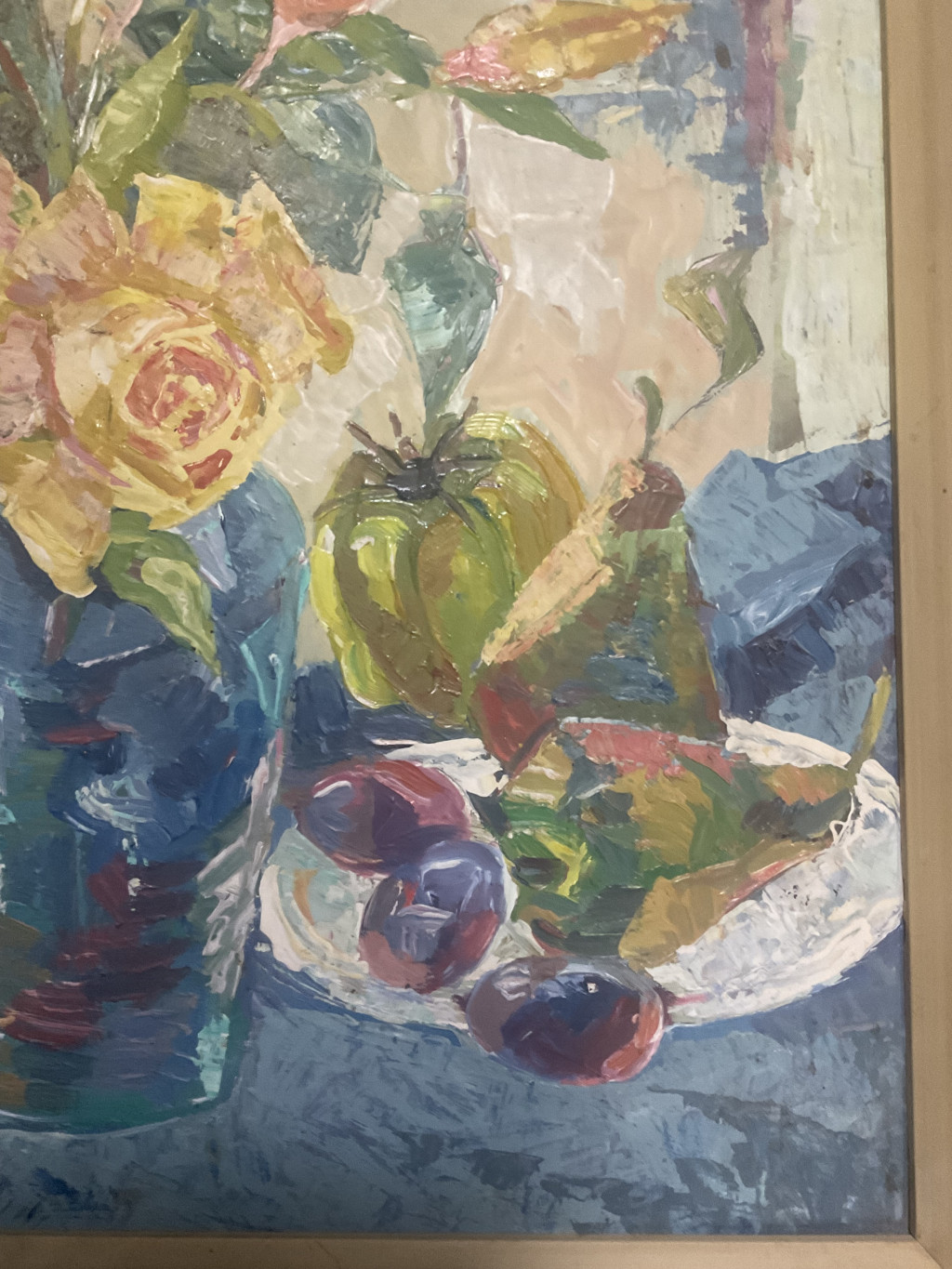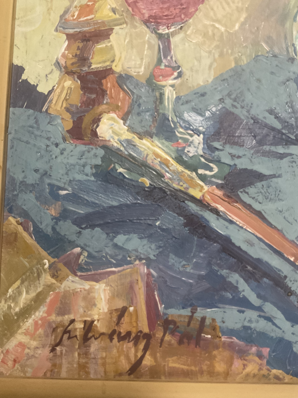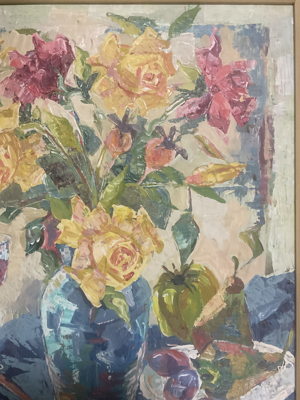 Szilvásy Pál festészetének jellegzetes darabja ez a színekben gazdag, lendületes csendélet, melyen a művész érzékletesen jeleníti meg a virágok és gyümölcsök harmóniáját egy pohár borral. A kompozíció középpontjában egy kék váza áll, benne élénk sárga és bíbor virágokkal. A festő vastag, határozott ecsetvonásokkal, oldott felületkezeléssel dolgozott, ami friss, vibráló hatást kelt. A háttér pasztelles árnyalatai és a terítő mélykékje szépen ellenpontozzák a virágok meleg színeit, így az egész kép derűs, mégis elegáns hangulatot áraszt.