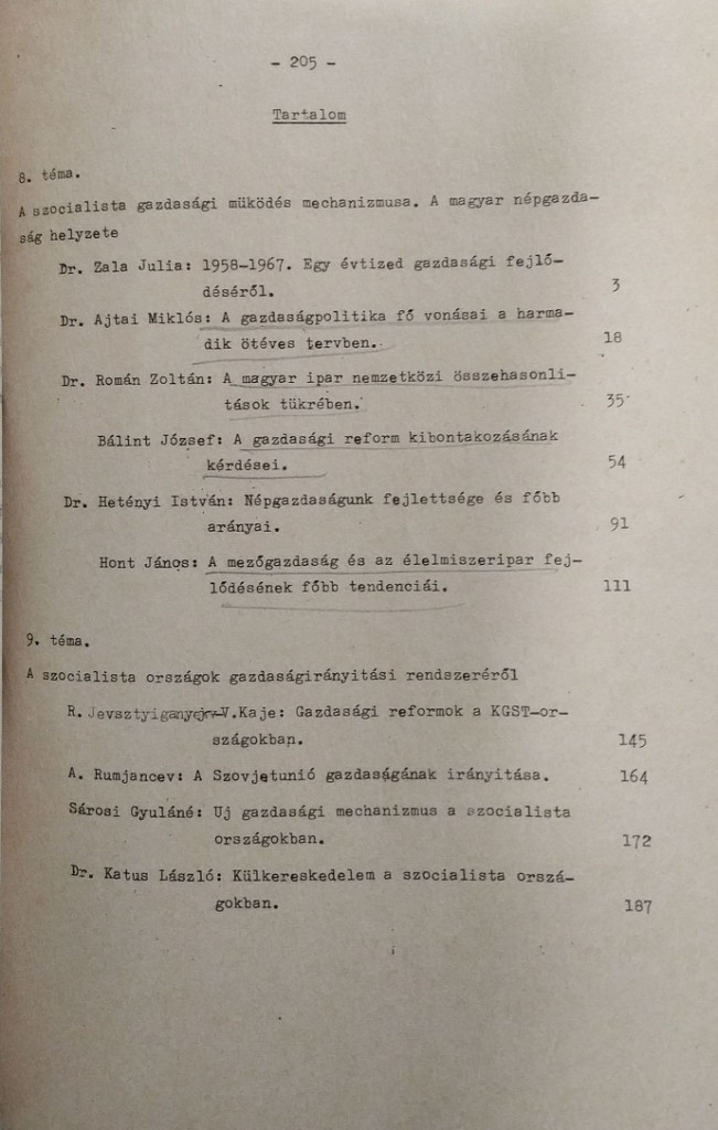 Olvasmányok az MSZMP Marxizmus-Leninizmus Esti Egyetemek Szocializmus politikai gazdaságtan szakosító tanfolyam I. évfolyam hallgatói részére, az 1969-1970-es tanévre. Összeállította és jóváhagyta a Marxizmus-Leninizmus Esti Egyetemének Magyar és Nemzetközi Munkásmozgalom Története Tanszéke. Segédanyag, II. rész 2. füzet 8. téma: A szocialista gazdasági működés mechanizmusa - A magyar népgazdaság helyzete 9. téma: A szocialista országok gazdaságirányítási rendszeréről