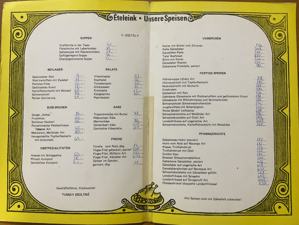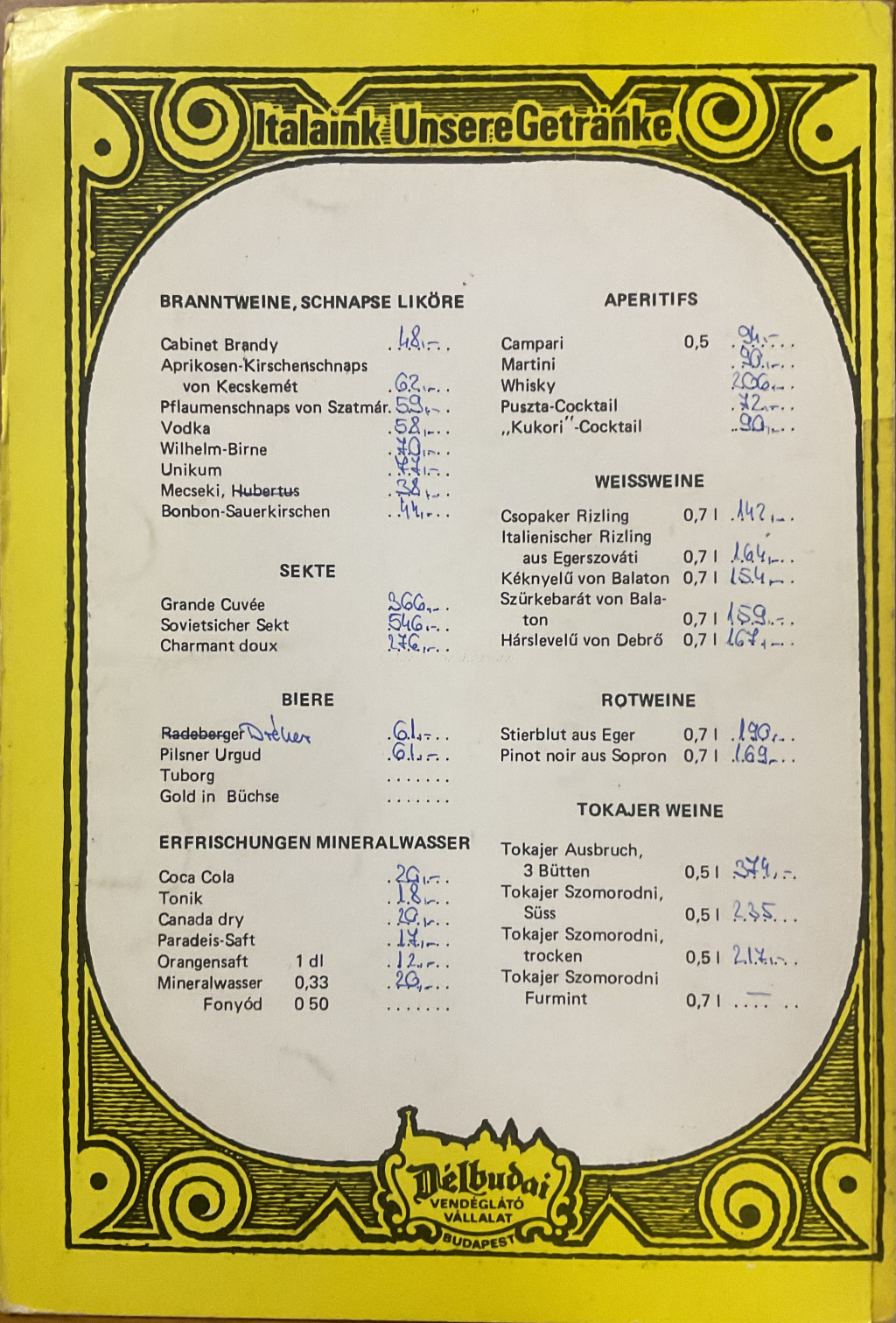 az oldalakon kisebb foltokkal; a függőleges hajtás mentén sérült, kb. 5 cm-en szakadt; beírt árakkal
