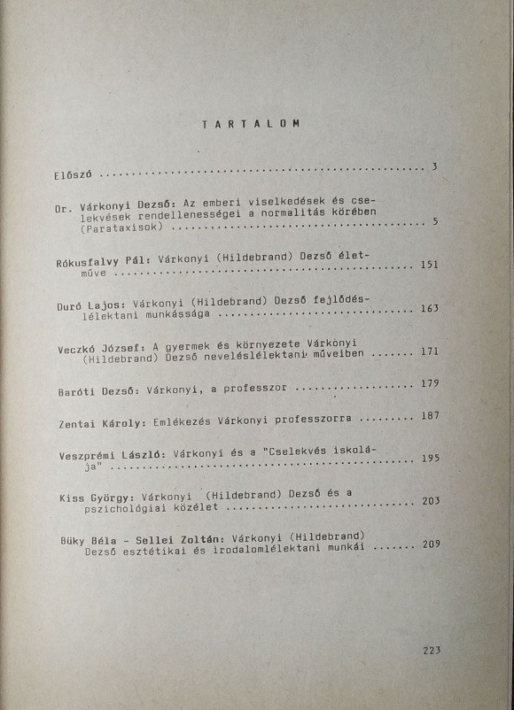 Acta Universitatis Szegediensis de Attila József Nominatae Section Paedagogica et Psychologica 30. Mindössze 300 példányban készült. Tartalom Előszó - 3 Dr. Várkonyi Dezső: Az emberi viselkedések és cselekvések rendellenességei a normalitás körében (Parataxisok) - 5 Rókusfalvy Pál: Várkonyi (Hildebrand) Dezső életműve - 151 Duró Lajos: Várkonyi (Hildebrand) Dezső fejlődéslélektani munkássága - 163 Veczkó József: A gyermek és környezete Várkonyi (Hildebrand) Dezső neveléslélektani műveiben - 171 Baróti Dezső: Várkonyi, a professzor - 179 Zentai Károly: Emlékezés Várkonyi professzorra - 187 Veszprémi László: Várkonyi és a "Cselekvés iskolája" - 195 Kiss György: Várkonyi (Hildebrand) Dezső és a pszichológiai közélet 203 Büky Béla - Sellei Zoltán: Várkonyi (Hildebrand) Dezső esztétikai és irodalomlélektani munkái 209