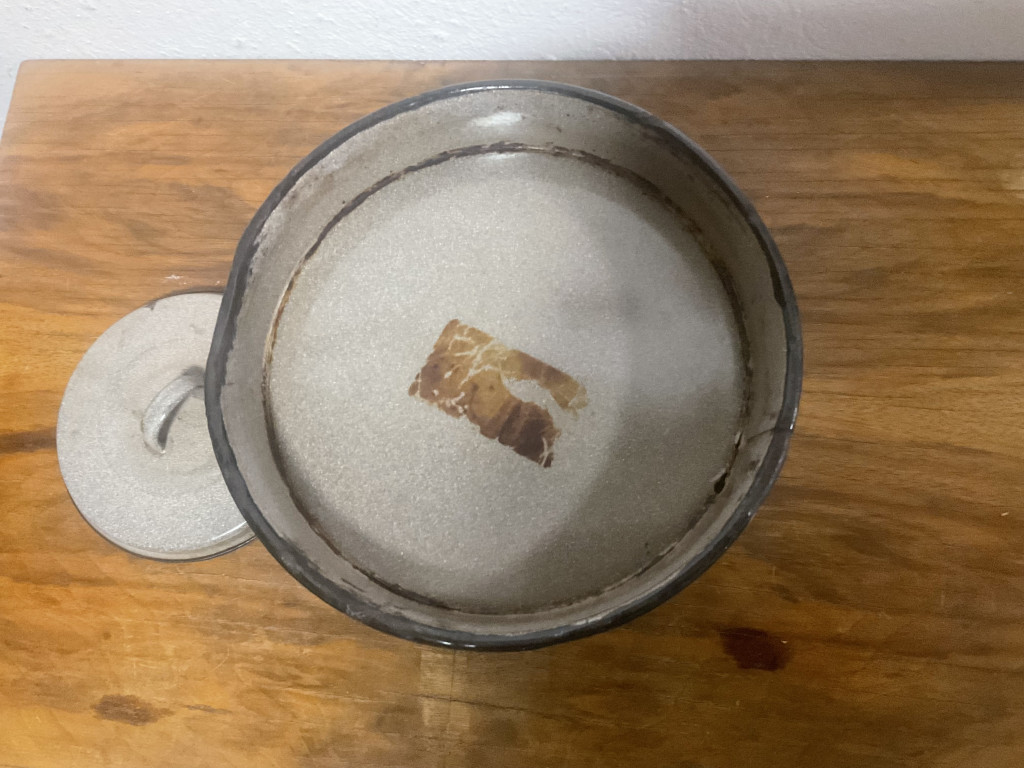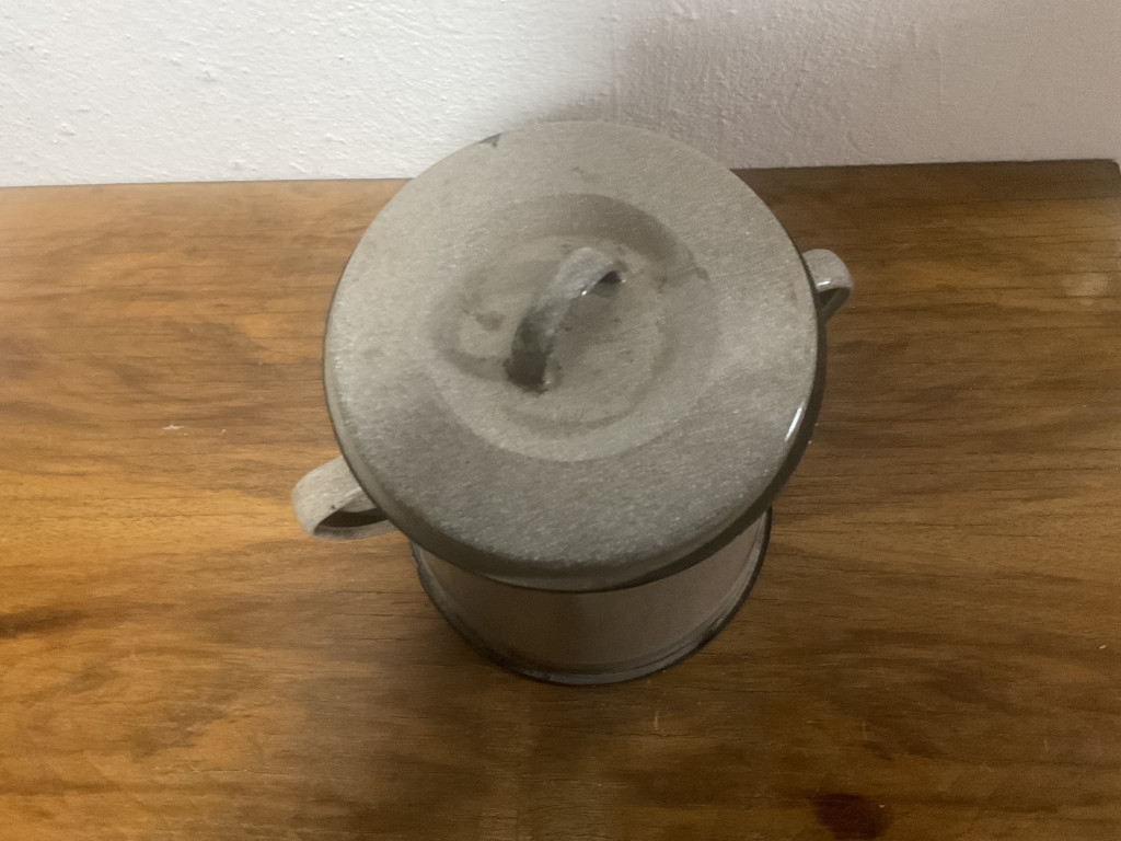 Magassága tetővel: 22 cm, talpátmérője: 16,5 cm. Kisebb horpadás az oldalán, tiszta belső.