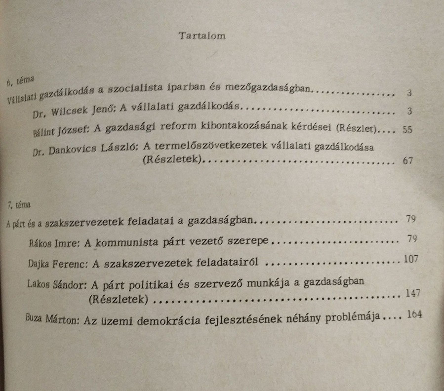 Olvasmányok az MSZMP Marxizmus-Leninizmus Esti Egyetemek Szocializmus politikai gazdaságtan szakosító tanfolyam II. évfolyam hallgatói részére, az 1969-1970-es tanévre. Összeállította és jóváhagyta a Marxizmus-Leninizmus Esti Egyetemének Magyar és Nemzetközi Munkásmozgalom Története Tanszéke. Segédanyag, II. rész 1. füzet 6. téma: Vállalati gazdálkodás a szocialista iparban és mezőgazdaságban 7. téma: A párt és a szakszervezetek feladatai a gazdaságban