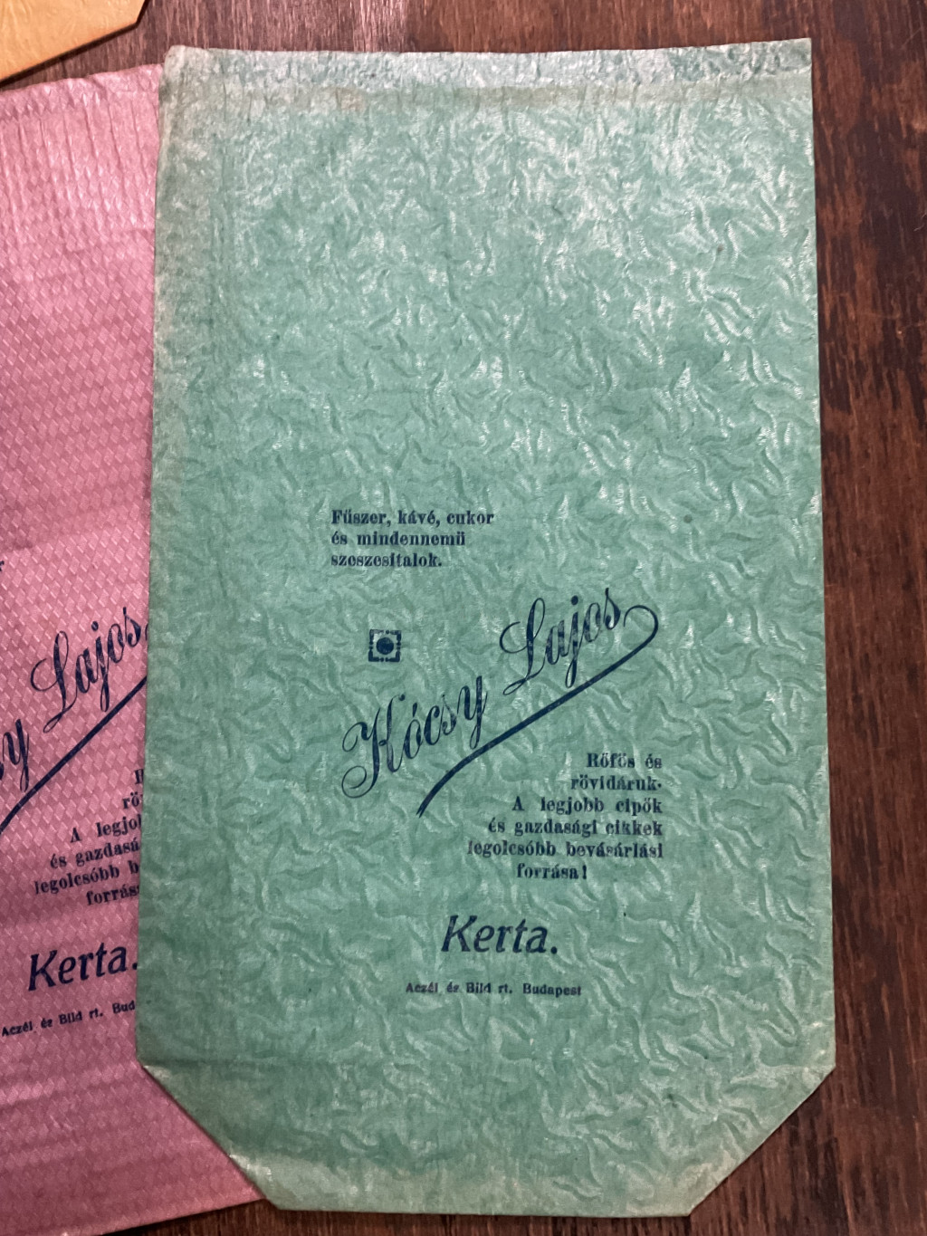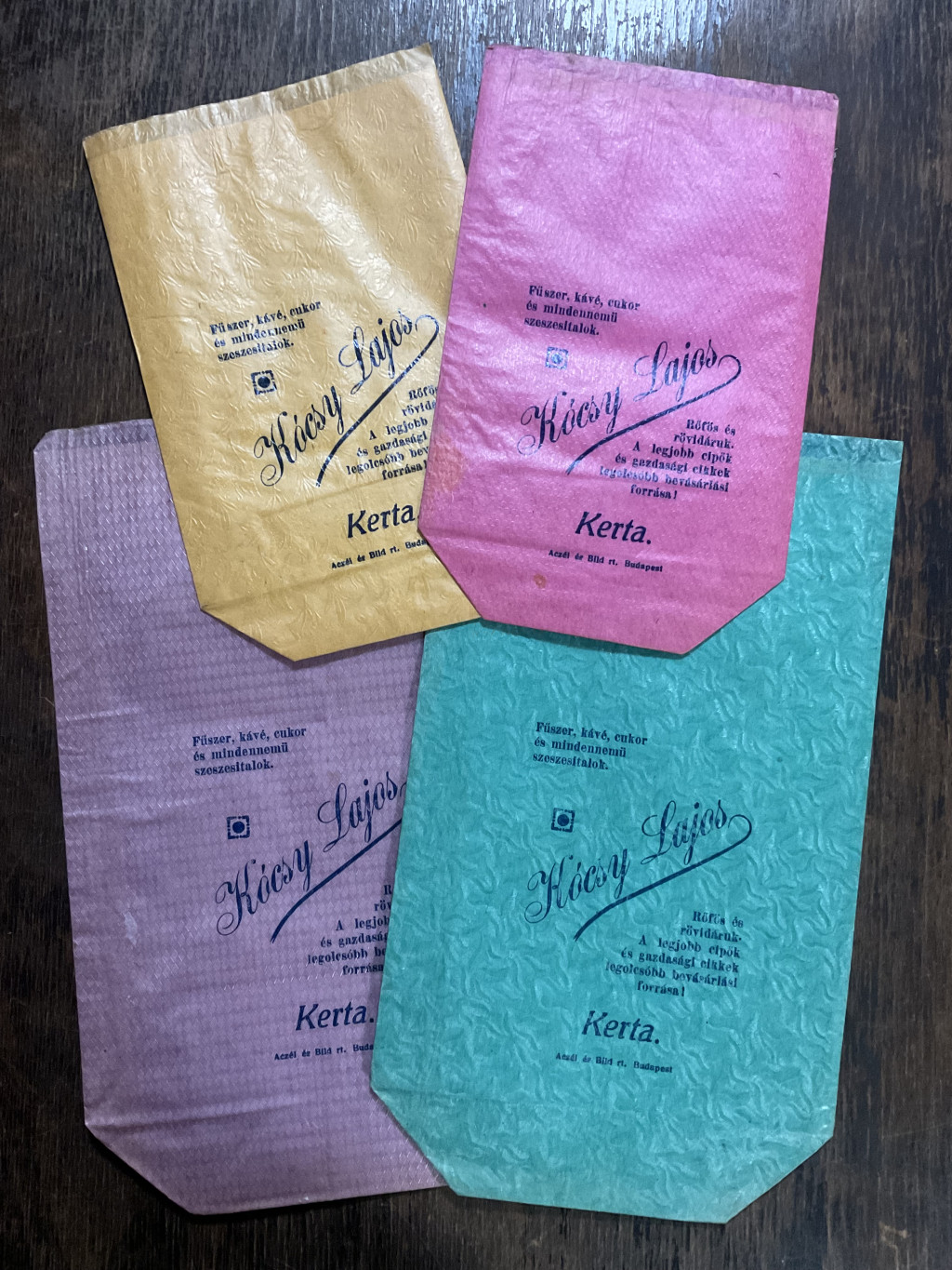 Kócsy Lajos Fűszer, kávé, cukor, rőfös és rövidárú - reklám papírtasak 1930 körül - 4 db