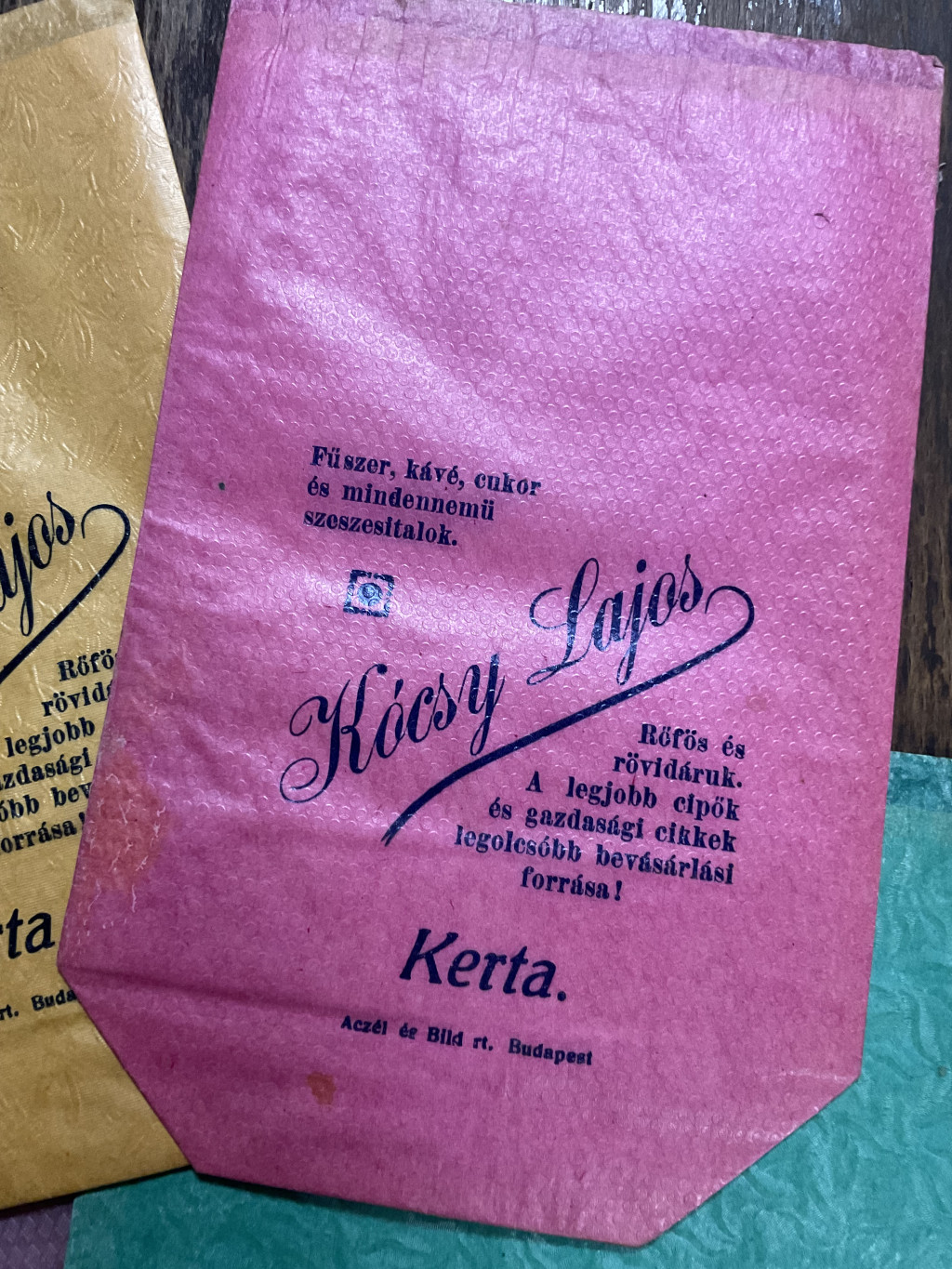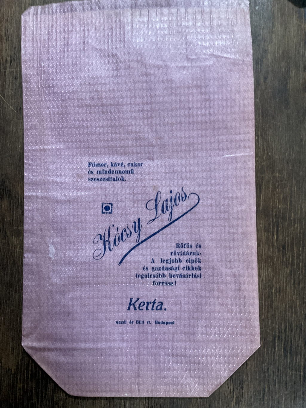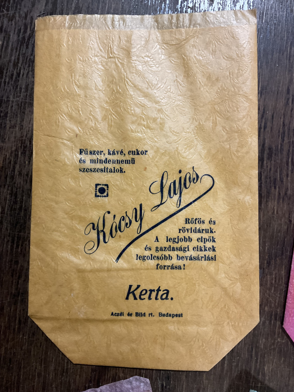 A fotókon látható papírzacskók a Kócsy Lajos által működtetett kiskereskedelmi üzletből származnak, amely a Veszprém vármegyei Kertában működött a 20. század első felében. Az üzlet széles áruválasztékkal szolgálta a környék lakosságát, amit a zacskó felirata is jelez