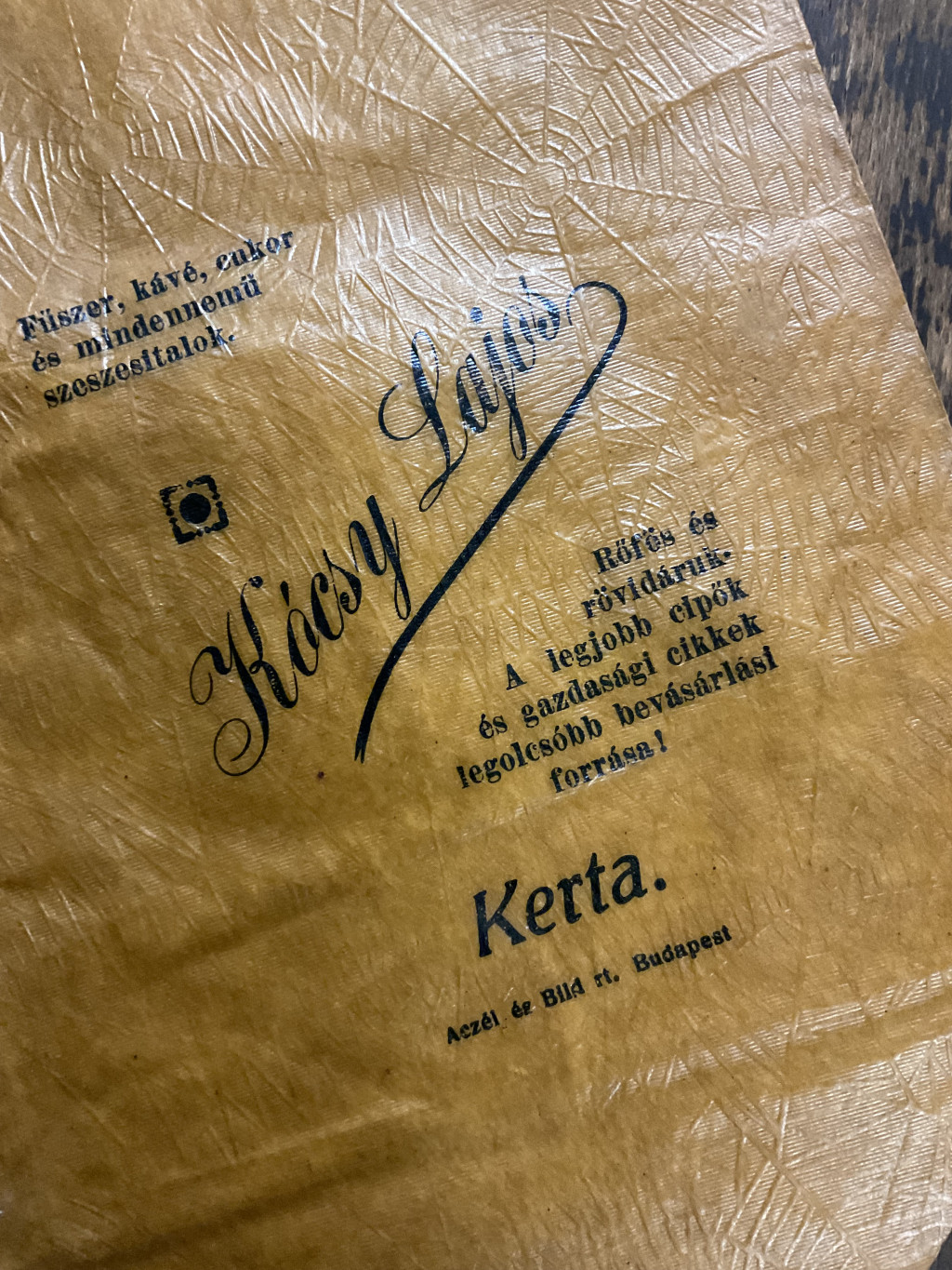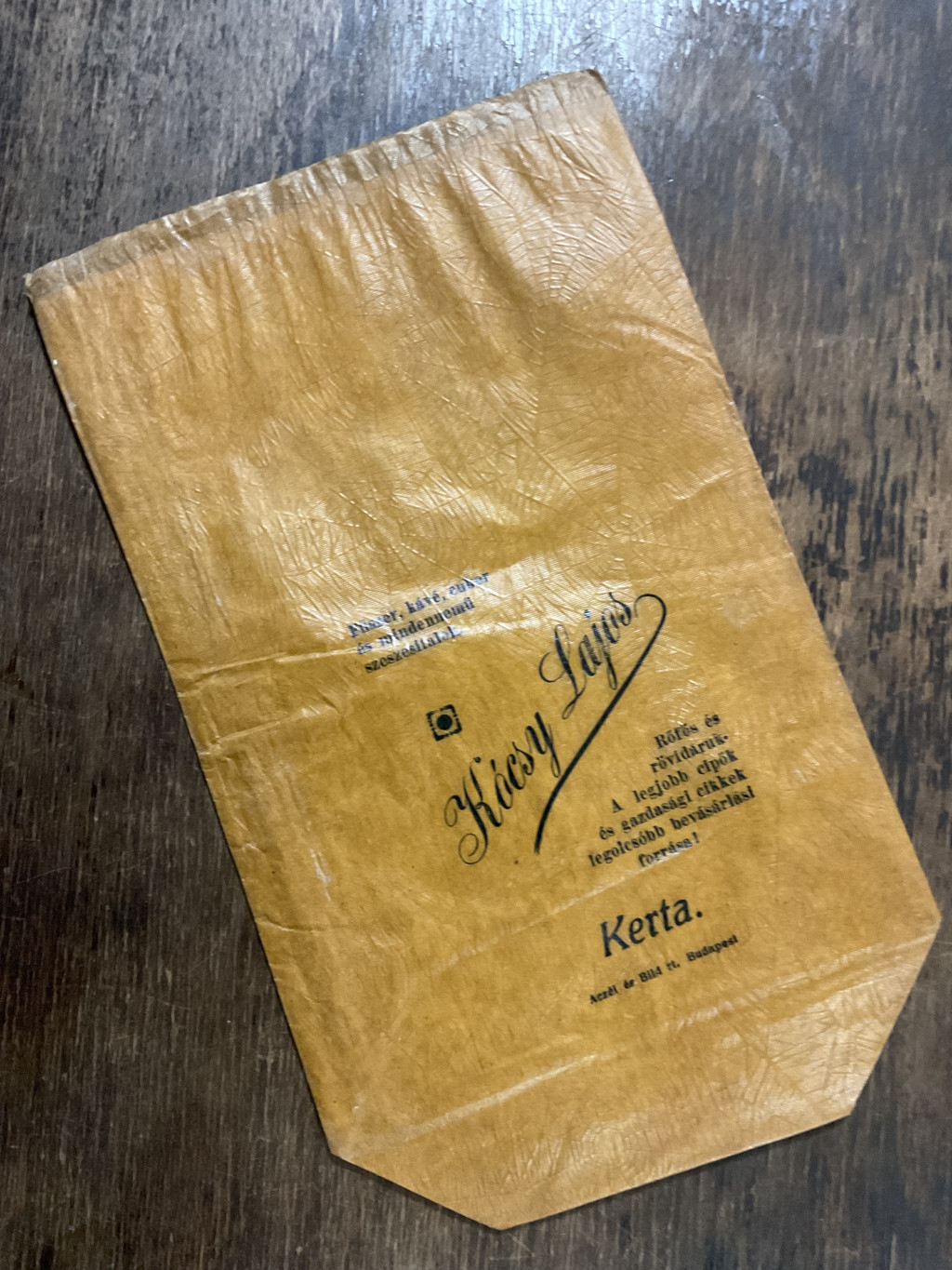 A fotókon látható papírzacskók a Kócsy Lajos által működtetett kiskereskedelmi üzletből származnak, amely a Veszprém vármegyei Kertában működött a 20. század első felében. Az üzlet széles áruválasztékkal szolgálta a környék lakosságát, amit a zacskó felirata is jelez