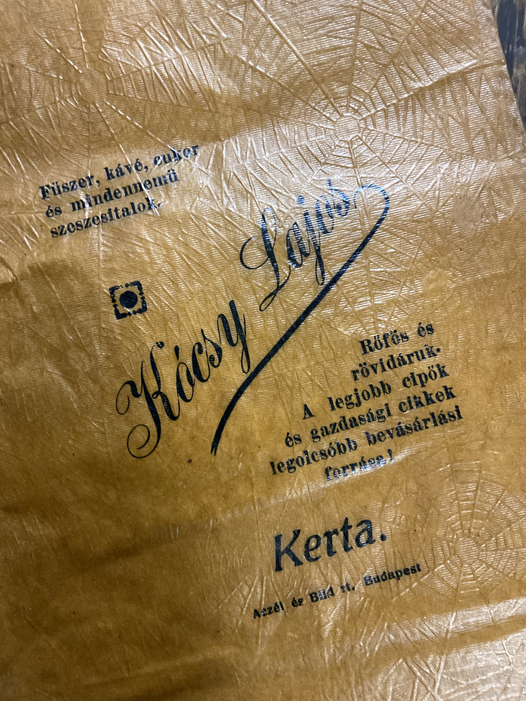 A fotókon látható papírzacskók a Kócsy Lajos által működtetett kiskereskedelmi üzletből származnak, amely a Veszprém vármegyei Kertában működött a 20. század első felében. Az üzlet széles áruválasztékkal szolgálta a környék lakosságát, amit a zacskó felirata is jelez