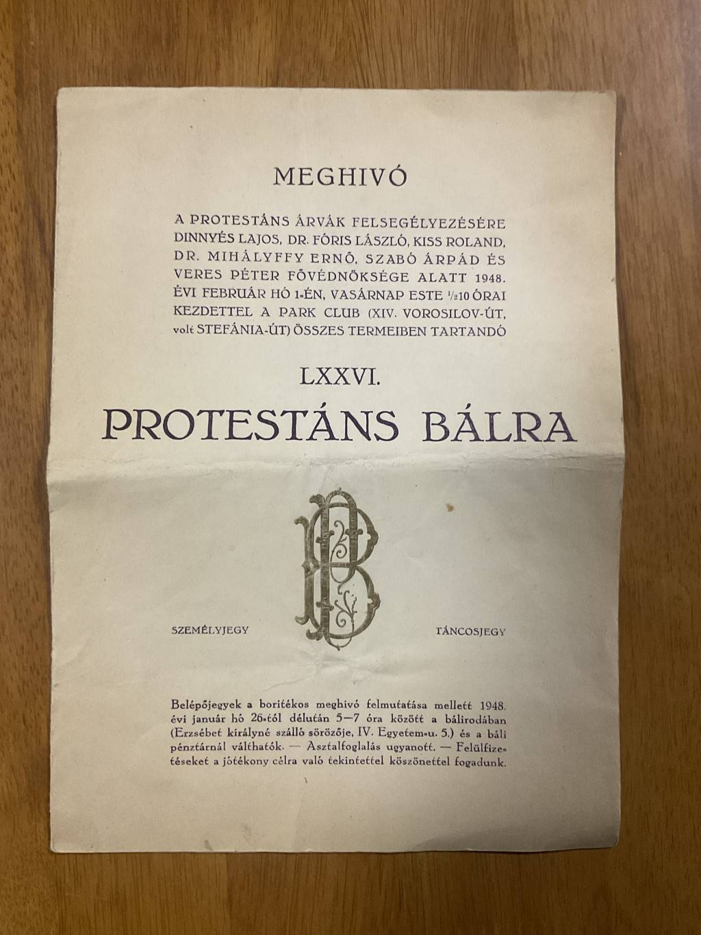 Eredeti, 1948-ban készült meghívó a LXXVI. Protestáns Bálra, jótékony céllal, a protestáns árvák megsegítésére.